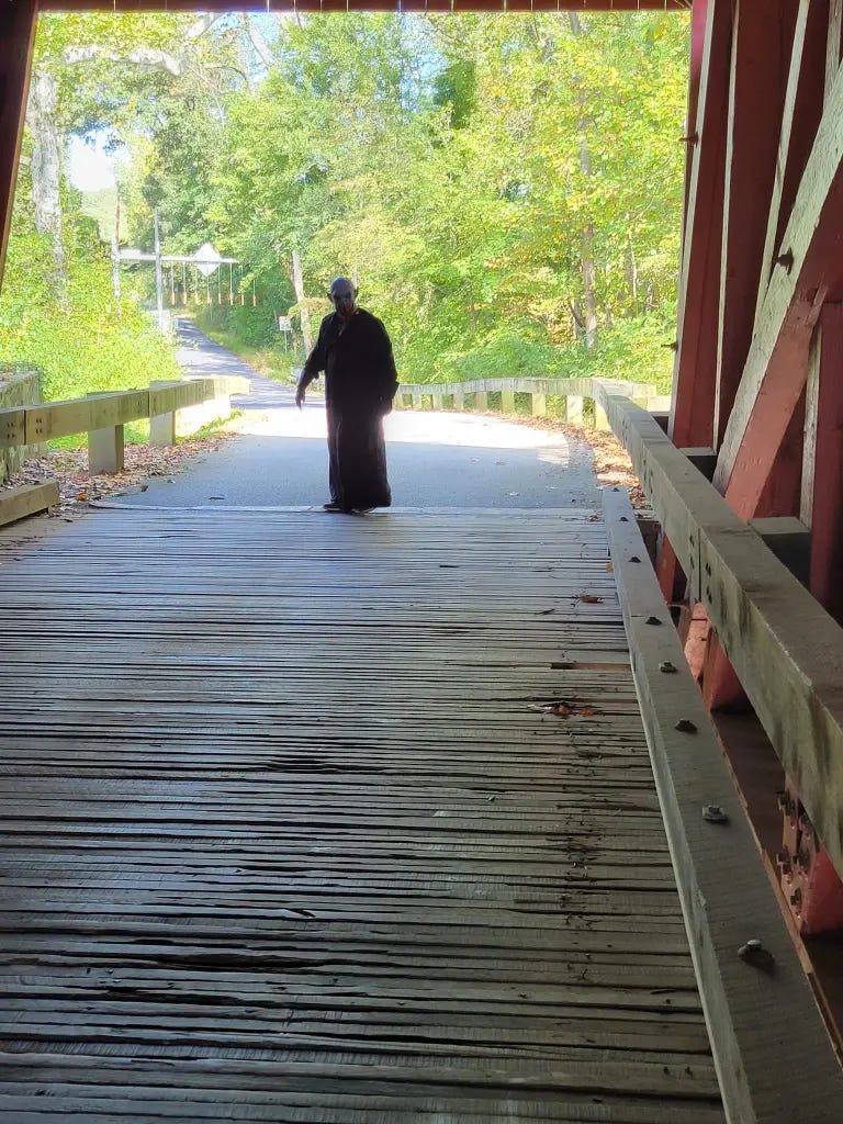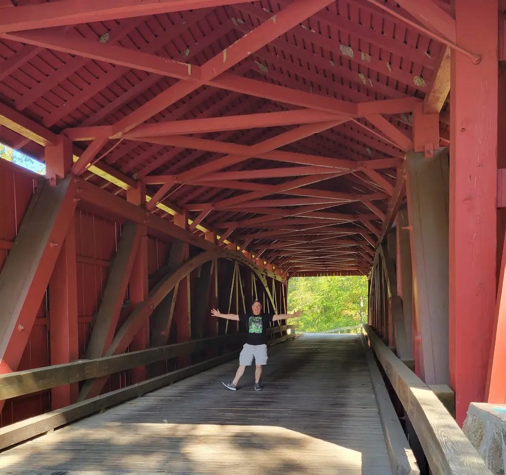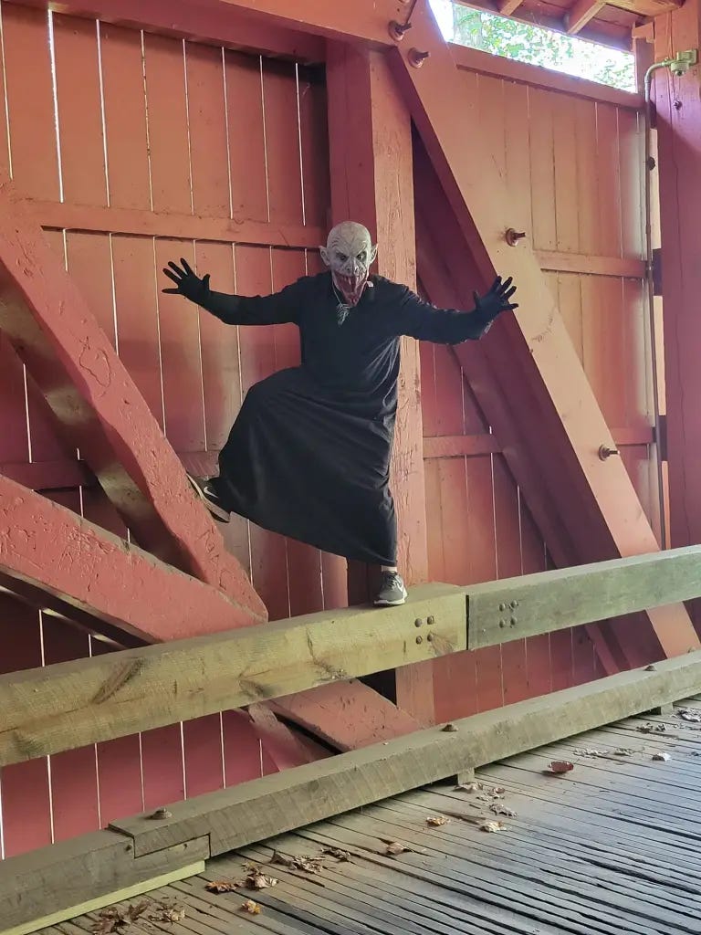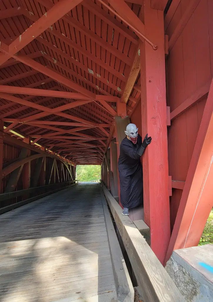 I had fun using a lost-footage motif at the end to hammer my story’s brutal denouement. I even had a blast with TJ when we took a drive out to Jericho Covered Bridge a week before Behind the Shadows’ release to get some goofy promotional photos using the bridge as backdrop.